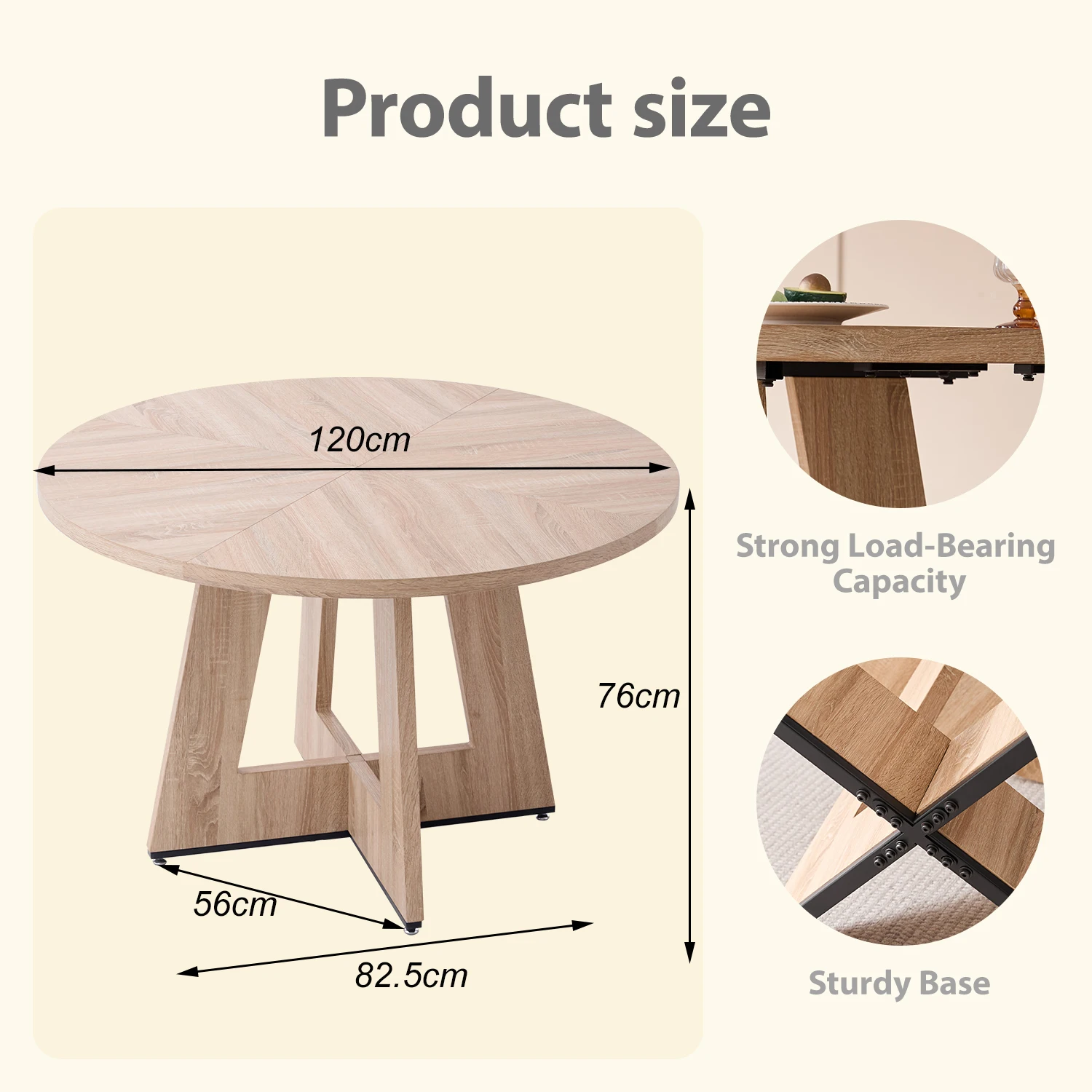Deze ronde eettafel 120cm is ontworpen voor woningen waar efficiënt ruimtegebruik belangrijk is. De ronde vorm verzacht strakke lijnen in het interieur en creëert een centrale plek voor ontbijt, diner of borrelmomenten. Het houten tafelblad met zichtbare houtstructuur geeft warmte aan de ruimte, terwijl het kruisvormige onderstel zorgt voor een stabiele basis tot 60 kg draagvermogen. Ideaal voor appartementen, moderne keukens of een knusse eetkamer.